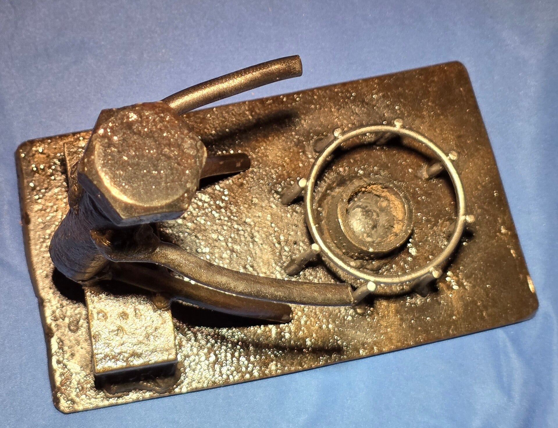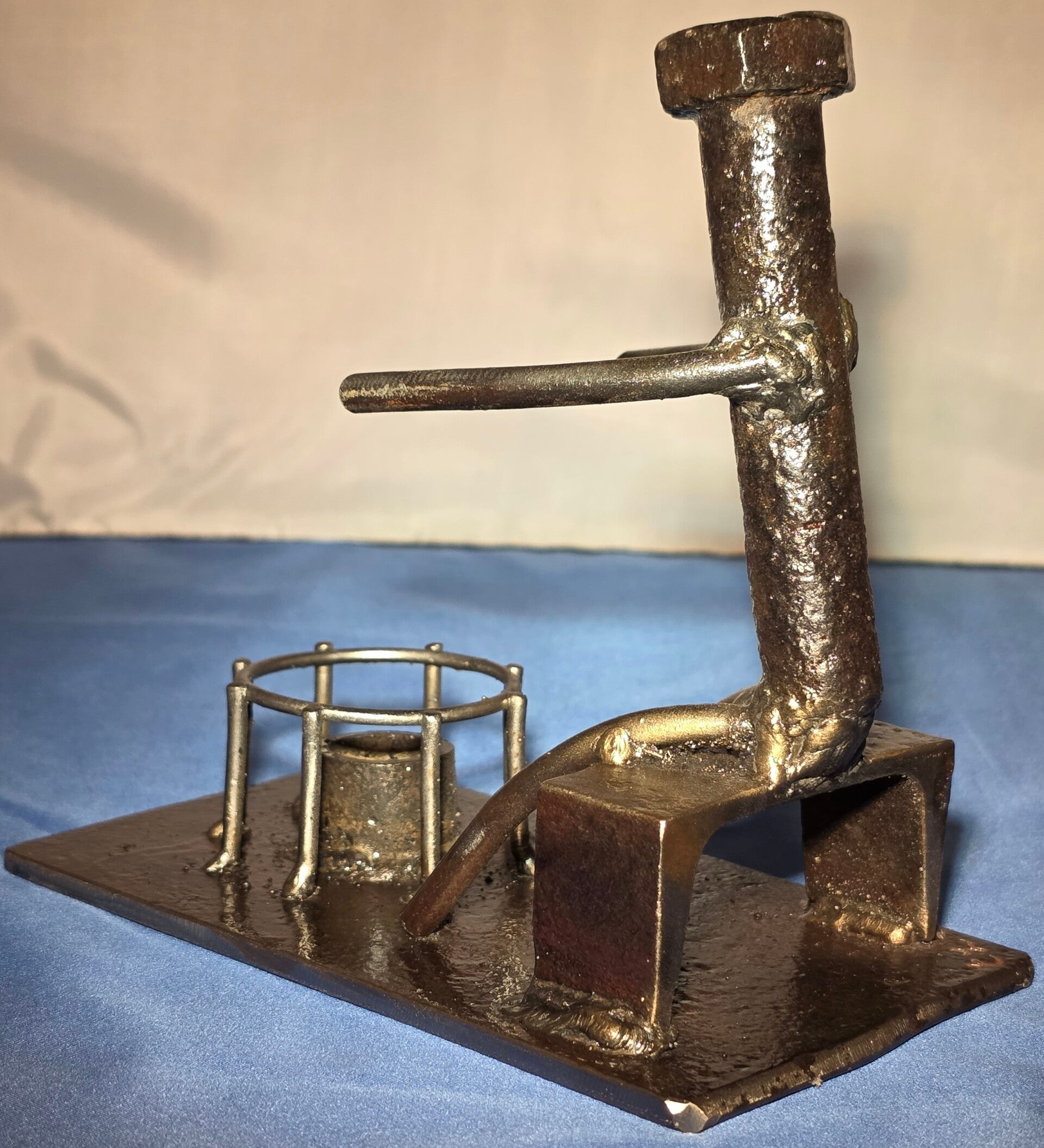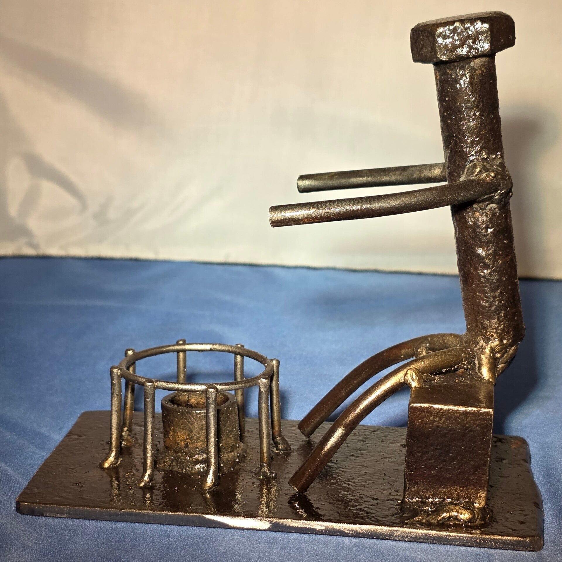 For the outdoor enthusiast, candle lover, or anyone who appreciates the warmth of a flickering flame without the worry, 'Night Fire' is a captivating piece. This functional upcycled art serves as a charming tea light holder, providing a safe space to reconnect with the serenity of nature. As you and the figure gaze into the dancing flames, it evokes a sense of deep thought and tranquil contemplation. Standing approximately 6 ¼ inches tall, with a width stretching 6 ¾ inches from the plate edge behind the bench to beyond the fire, and a depth of 3 ¼ inches that feels as expansive as a wilderness vista, 'Night Fire' captures the essence of a cozy campfire. Like all our creations, it's meticulously initialed by the artist and double-coated with a clear enamel for lasting beauty and weather protection, making it ideal for both indoor and outdoor display.