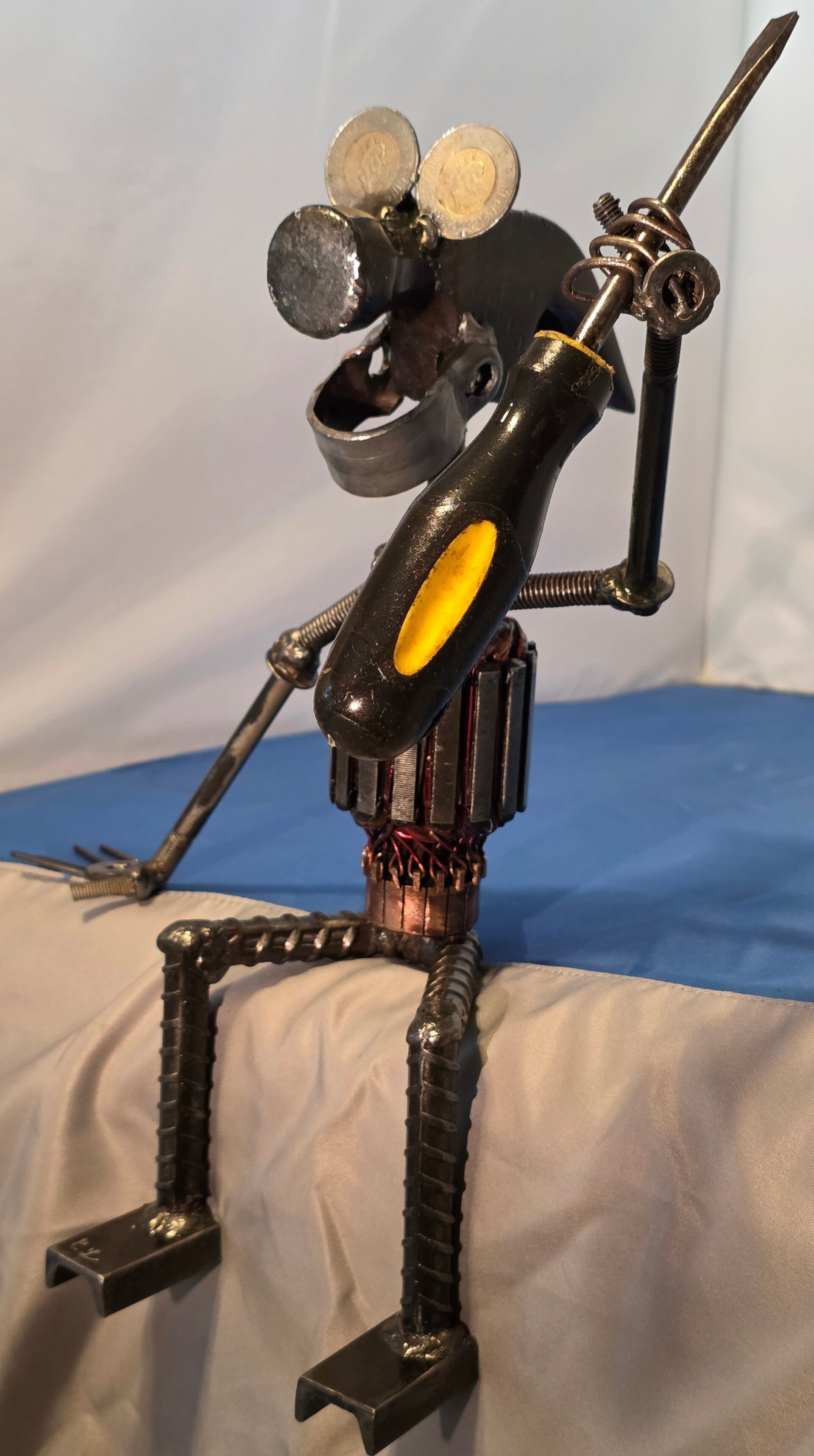 Introducing 'The Handyman,' a unique piece that captures the essence of a craftsman crafted from the very materials and tools of the trade. This art piece embodies the spirit of the handyman, making it an ideal addition for tradespeople, enthusiastic craftsperson, or anyone who appreciates the beauty of eccentric art. The handyman is depicted in a moment of rest, setting whilst grabbing his tool and taking a deep breath, conveying a sense of quiet determination. Standing approximately 12 3/8 inches tall from the bottom of the feet, with a span of 10 inches from the fingertips of his right hand to the back of his left, and a depth of only 5 ¾ inches (a testament to his hard work), he's ready to join your crew. As with all our works it is meticulously initialed by the artist and finished with a clear, double-coated enamel, this piece offers lasting beauty and weather protection for both indoor and outdoor settings.