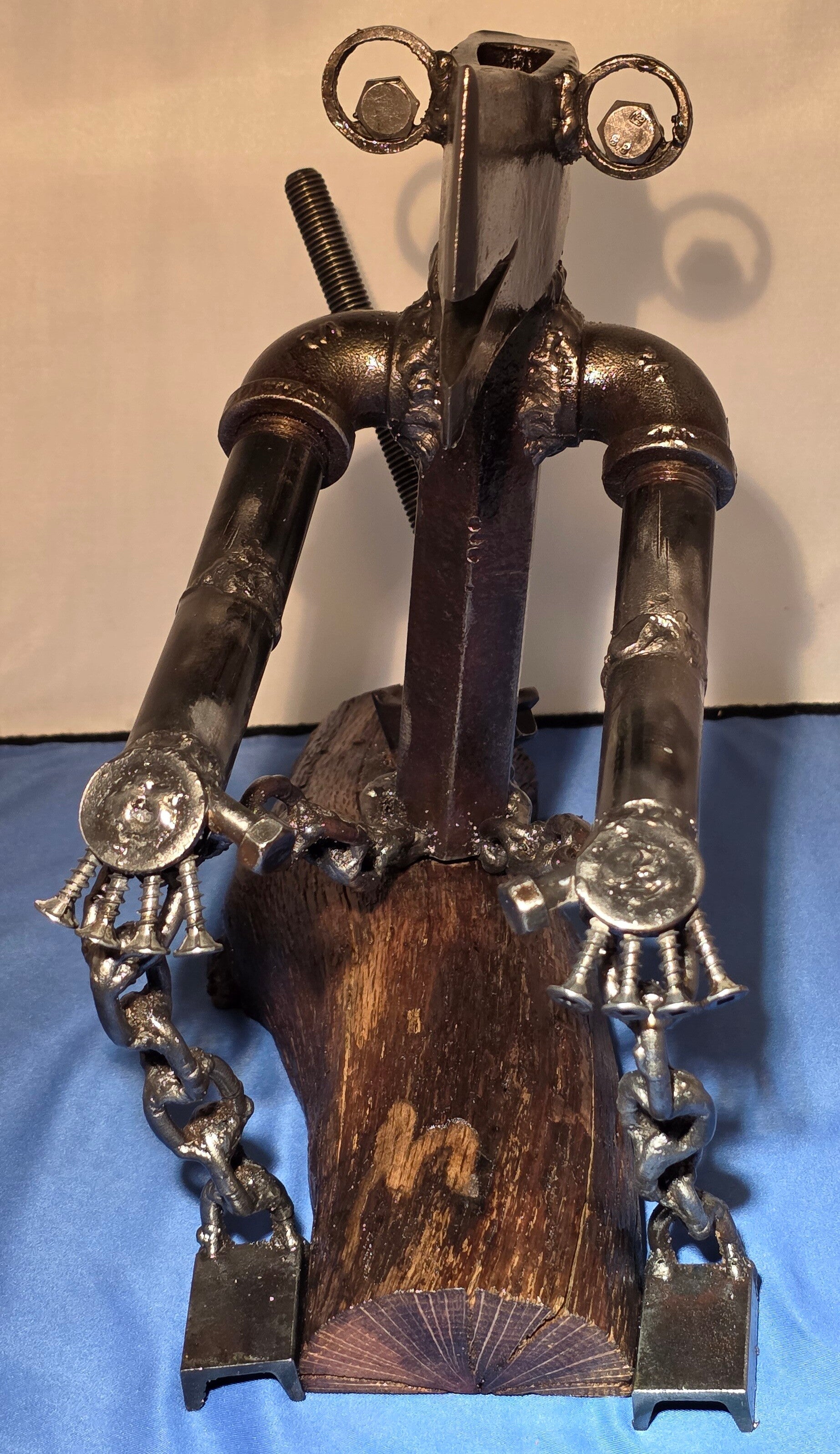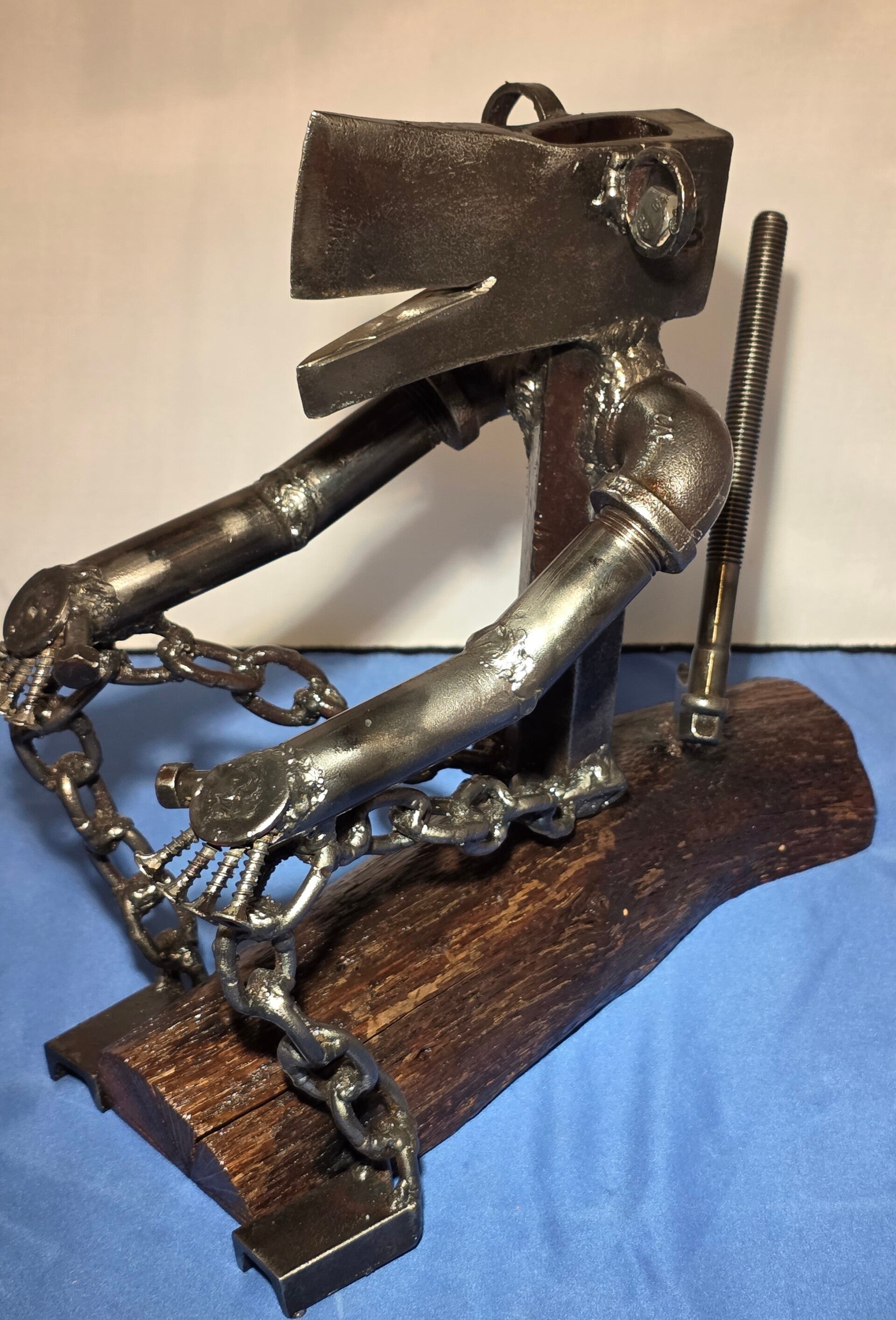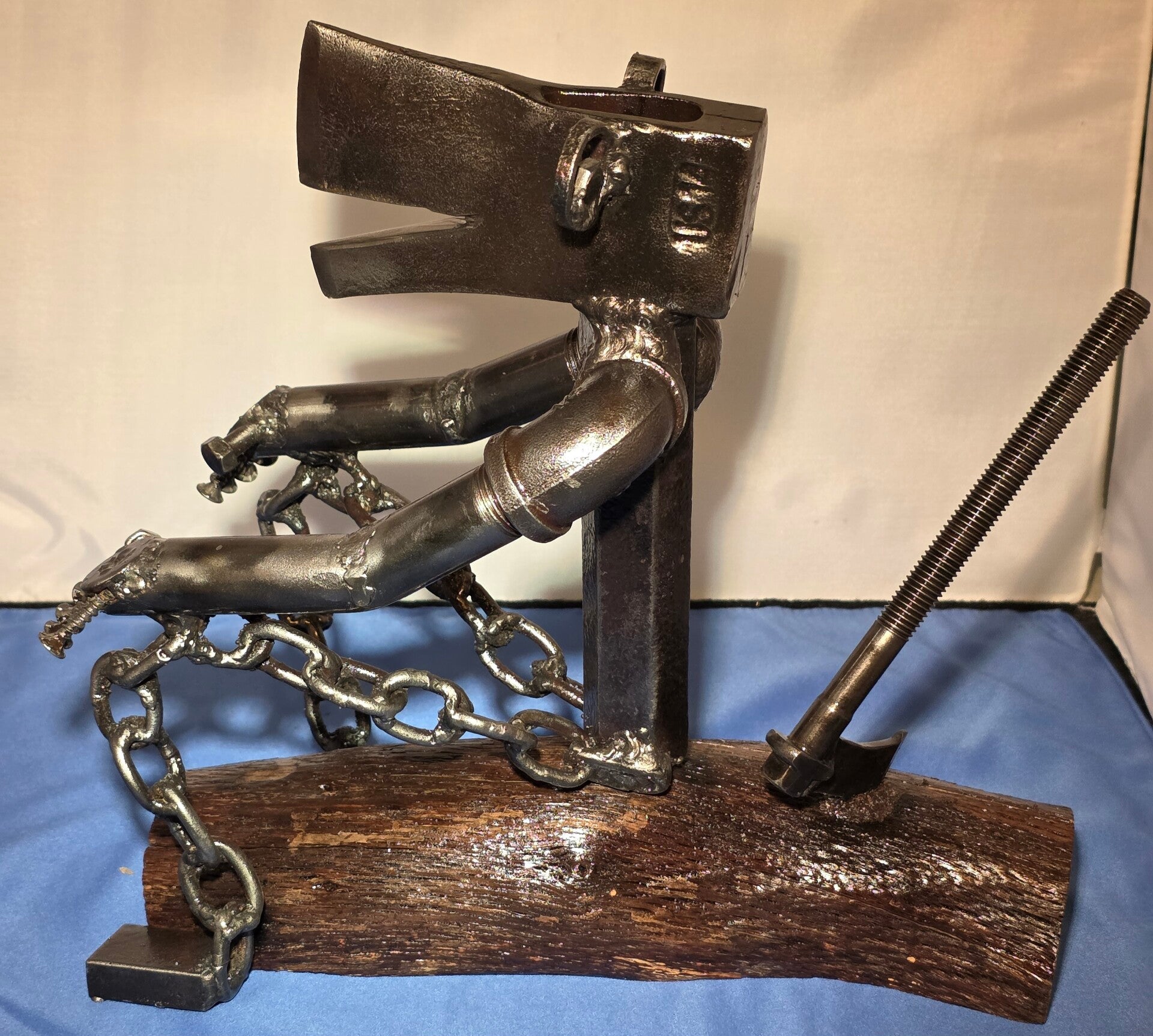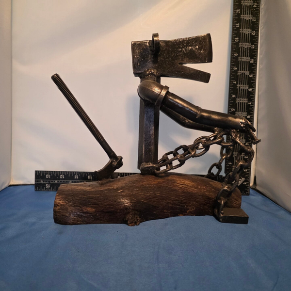 "The Lumberjack" is a truly unique sculpture that masterfully embodies the spirit of the trade, crafted from the very materials and tools a lumberjack uses. This piece is more than just art; it's a tribute to hard work and dedication, perfect for anyone in the lumber industry, passionate woodworkers, or collectors of distinctive, handcrafted art. The piece captures a moment of quiet accomplishment, as the lumberjack catches his breath on the very tree he has just felled, his ax firmly planted behind him, taking a deep breath and reflecting on a job well done. Standing at approximately 10 1/2 inches tall, with a width of 11 ½ inches and a depth of 5 1/2 inches, this sculpture serves as a powerful reminder to take pride in your work while appreciating the beautiful tranquility of nature and appreciate the journey. As with all our creations, it is initialed by the artist and finished with a clear, double-coated enamel, offering lasting beauty and weather protection for both indoor and outdoor displays.