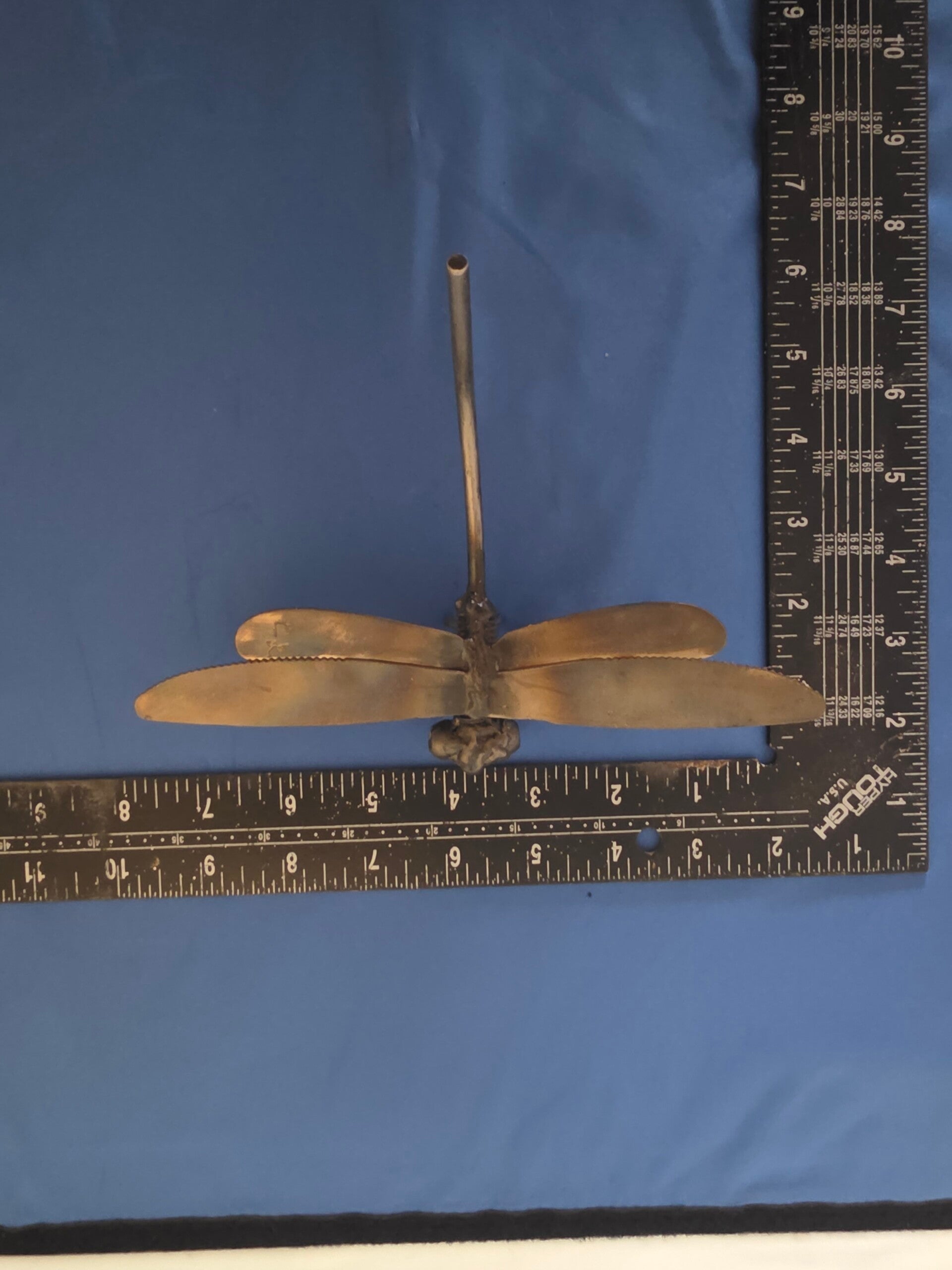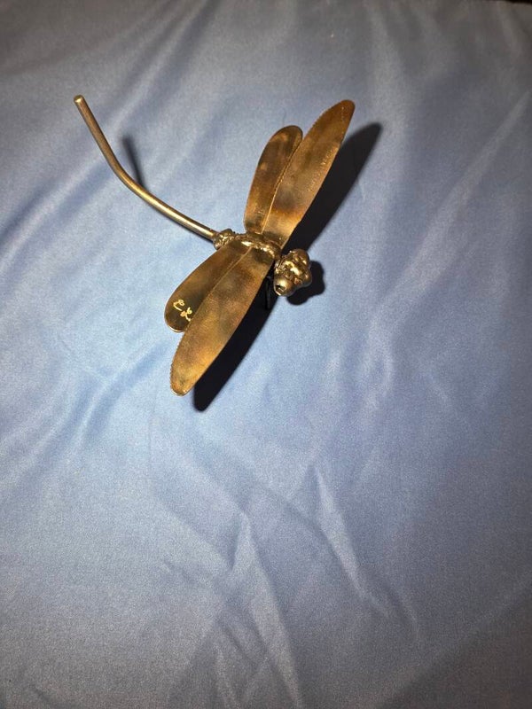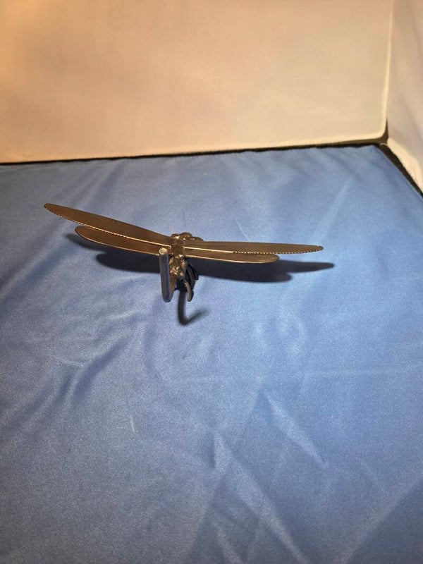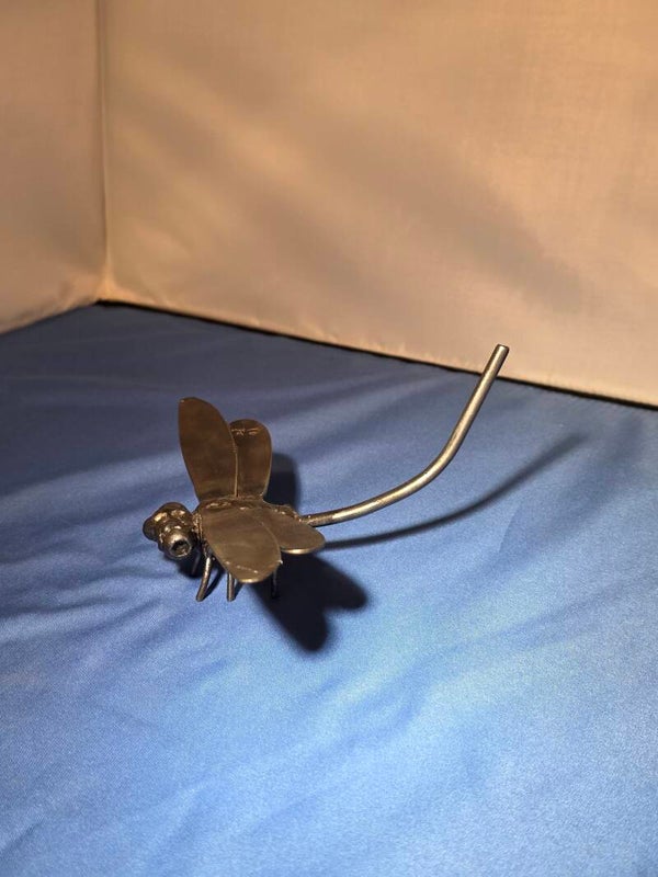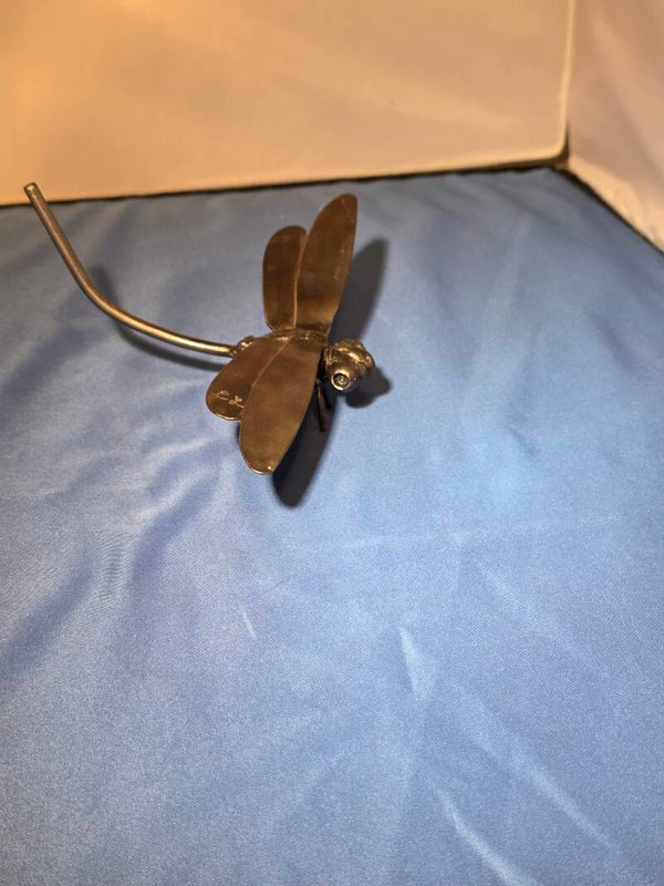 "Graceful Flyer": A captivating ode to nature's delicate beauty, this unique, upcycled art piece embodies the spirit of the solitary insect it portrays. Crafted from repurposed materials, this artwork stands approximately 3 ½ inches tall, 7 ½ inches wide, and 5 ¼ inches long, becoming a striking focal point in any setting. With its mesmerizing multicolor tinted wings, this one-of-a-kind creation is poised for flight, ready to add a touch of whimsy and elegance to the collection of any outdoors enthusiast, nature lover, or insect admirer. As with all our creations, it is initialed by the artist and finished with a clear, double-coated enamel, offering lasting beauty and weather protection for both indoor and outdoor displays.