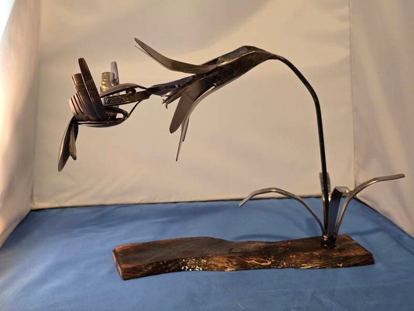 Pattering Wings is a captivating sculpture that instantly transports you to the beauty of the outdoors. This exquisite piece masterfully portrays a majestic hummingbird poised as it daintily sips nectar from a vibrant flower. Measuring approximately 9 ½ inches tall, 15 inches long, and 6 ½ inches wide, it is the perfect display for any discerning bird watcher, nature enthusiast, or art collector. Crafted with meticulous attention to detail, the sculpture is initialed by the artist and protected with a durable, double-coated enamel finish, ensuring its lasting beauty.