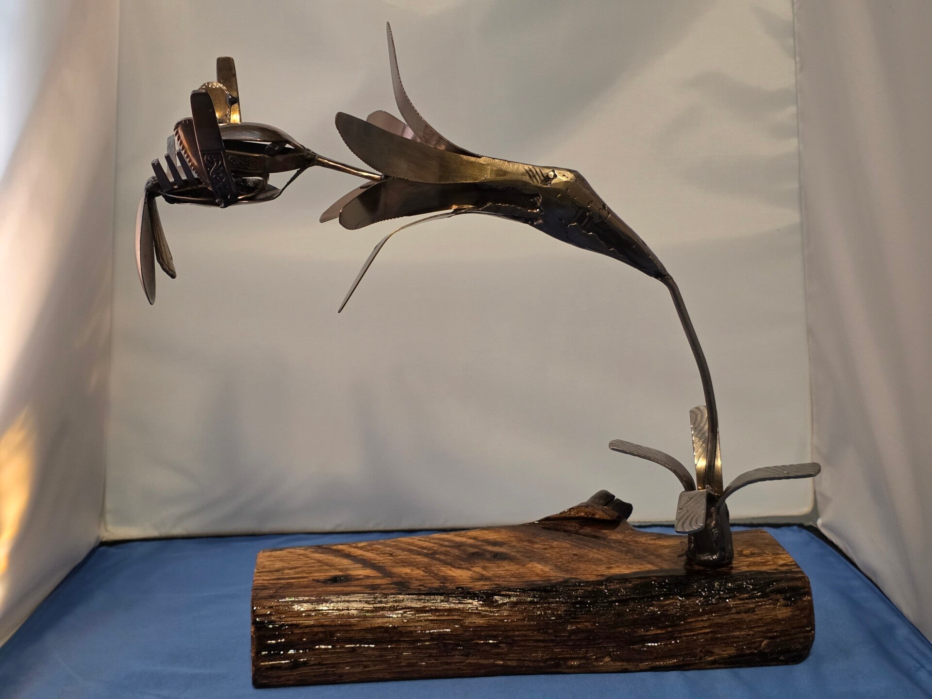 "Hum of Wings" is a captivating, exquisite sculpture that instantly evokes the serene beauty of the outdoors. This masterful piece artfully portrays a majestic hummingbird poised in a moment of delicate grace as it sips nectar from a vibrant flower. Measuring approximately 13 inches tall, 13 inches long, and 6 inches wide, it is an ideal display piece for any discerning bird watcher, nature enthusiast, or art collector. The sculpture is crafted with meticulous attention to detail, initialed by the artist, and protected with a durable, double-coated enamel finish, ensuring its lasting brilliance and enduring beauty.