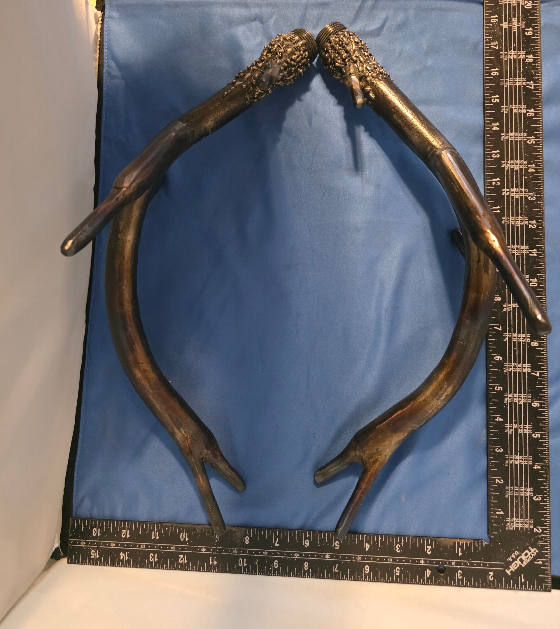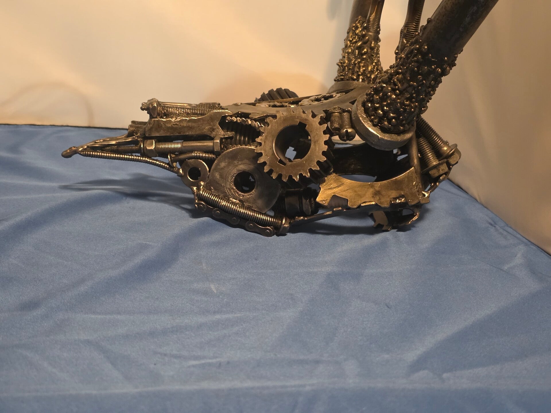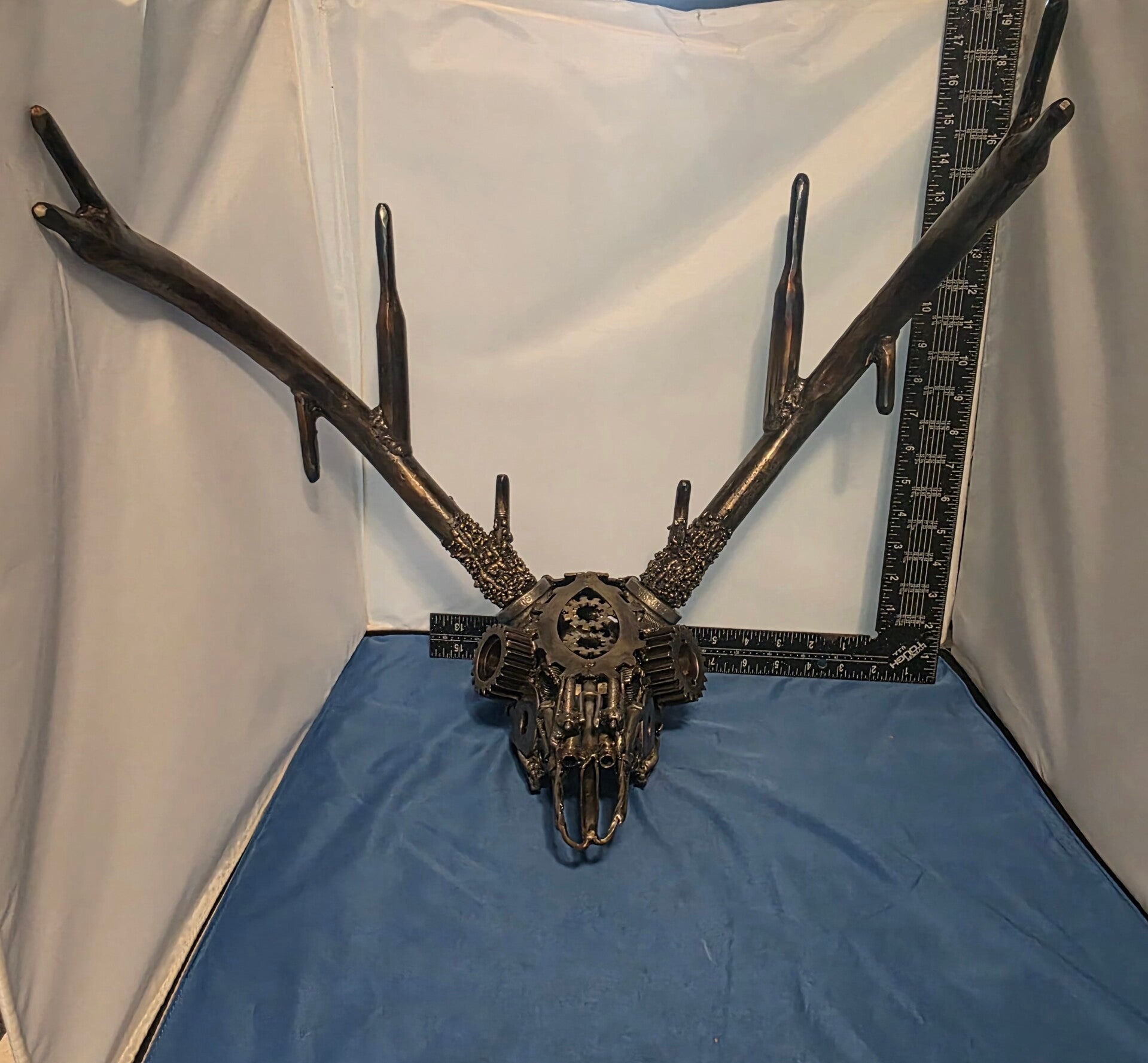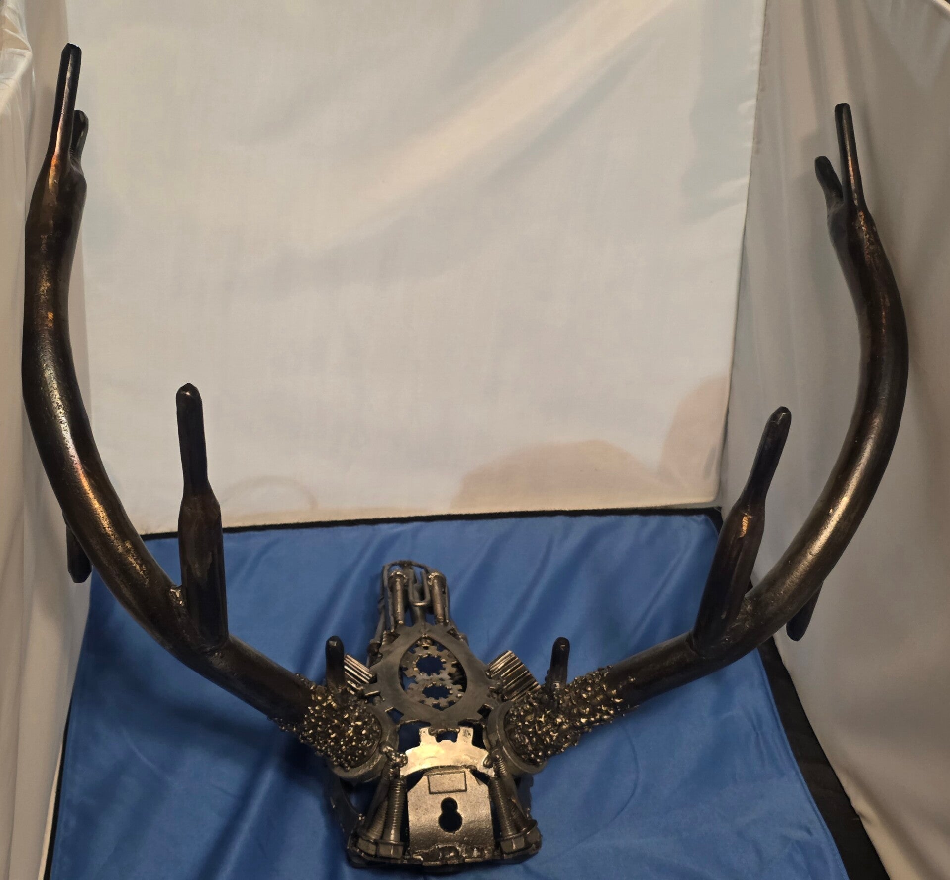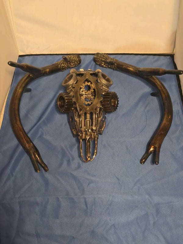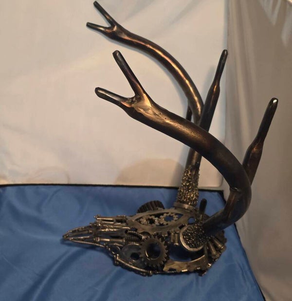 "Industrial Stag" is a captivating sculpture that masterfully merges the organic forms of nature with the cold, hard elements of the industrial world, depicting the intricate skull of a buck. This piece immediately draws you in, creating a compelling visual tension as if you are locking eyes with a machine. The sculpture measures approximately 18 inches in height, with an impressive antler span of 19 inches and a depth of 13 inches from the back of the skull to the tip of his snout. Protected with a double-coated enamel finish for lasting beauty, the piece is initialed by the artist, ensuring authenticity. This unique creation is a perfect gift for hunters, nature lovers, and art enthusiasts alike.